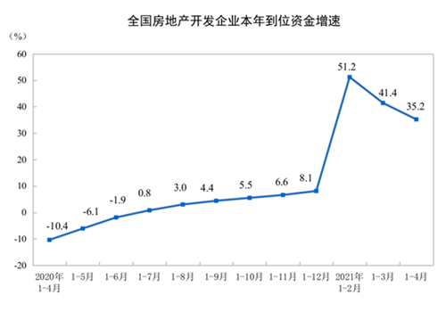 1—4月份,房地產開發(fā)企業(yè)到位資金63542億元,同比增長35.2%;比2019年1—4月份增長21.1%,兩年平均增長10.1%。其中,國內貸款9043億元,增長3.6%;利用外資17億元,下降28.3%;自籌資金17167億元,增長15.4%;定金及預收款24362億元,增長74.1%;個人按揭貸款10738億元,增長41.3%。