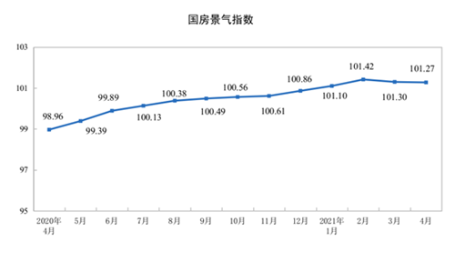 4月份,房地產開發(fā)景氣指數(shù)(簡稱“國房景氣指數(shù)”)為101.27。