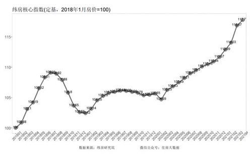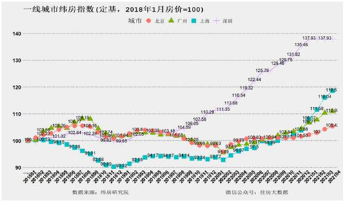 但進(jìn)入2021年1月以來(lái),漲速有顯著的加速,一二線城市出現(xiàn)一波房?jī)r(jià)小陽(yáng)春。其中2021年3月緯房核心指數(shù)的環(huán)比漲幅高達(dá)2.49%,為2018年1月以來(lái)的房?jī)r(jià)漲速最高值。