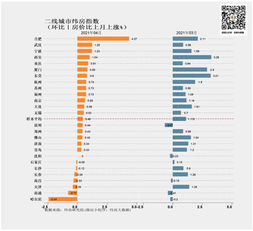 二線城市中,4月合肥、武漢、寧波、西安、重慶、廈門、東莞、杭州等城市房?jī)r(jià)環(huán)比漲速均相對(duì)較高。其中合肥、武漢、重慶漲速有所上升,其它城市漲速以下降為主。哈爾濱、長(zhǎng)春、天津、長(zhǎng)沙等區(qū)域代表性城市房?jī)r(jià)穩(wěn)中有降。