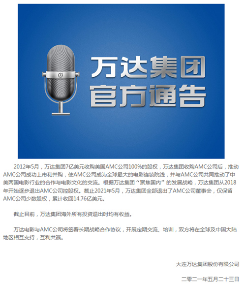 5月23日,萬達(dá)集團(tuán)發(fā)布通告稱,截止2021年5月,萬達(dá)集團(tuán)全部退出了AMC公司董事會,僅保留AMC公司少數(shù)股權(quán),累計(jì)收回14.76億美元。(房訊網(wǎng))