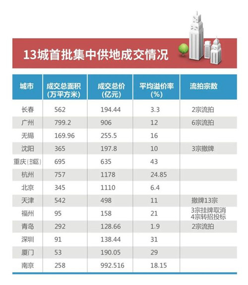 首批集中供地的13個(gè)城市覆蓋東北、華北、華東、華南和西南五大區(qū)域,東北地區(qū)為沈陽、長(zhǎng)春,華北地區(qū)為北京、天津、青島,華東地區(qū)為杭州、無錫和南京,華南地區(qū)為廣州、深圳、福州、廈門,西南區(qū)域?yàn)橹貞c。