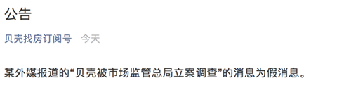 5月25日,貝殼發(fā)布公告稱,某外媒報道的“貝殼被市場監(jiān)管總局立案調(diào)查”的消息為假消息。