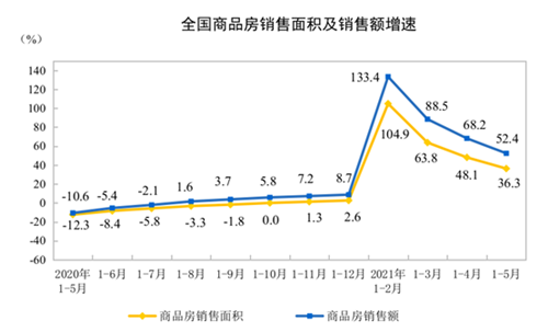 從銷售額來看,商品房銷售額70534億元,增長52.4%;比2019年1—5月份增長36.2%,兩年平均增長16.7%。其中,住宅銷售額增長56.5%,辦公樓銷售額增長24.9%,商業(yè)營業(yè)用房銷售額增長10.3%。