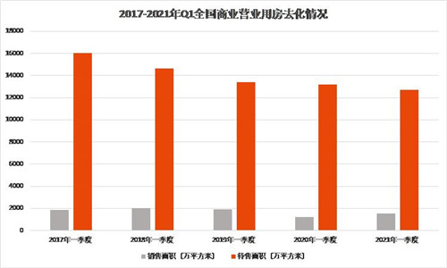 銷售方面,2021年一季度商業(yè)營業(yè)用房銷售面積較2020年一季度增長24.9%,較2019年仍有差距,并沒有完全恢復(fù)到疫情前的情況。存量上,2021年一季度商業(yè)營業(yè)用房待售面積同比下降3.7%,庫存量相對減少。不可忽視的是,在新開工面積增長的前提下,未來市場仍將面臨著較大的去化壓力。