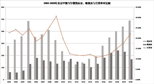 從全國來看,當前商業(yè)辦公行業(yè)面臨的挑戰(zhàn)主要集中體現(xiàn)在連續(xù)多年的供應(yīng)高峰,推動空置率的走高和租金(售價)水平的下降。根據(jù)房訊指數(shù)統(tǒng)計,2020年下半年一線城市寫字樓空置率全部在20%以上運行,均創(chuàng)十年新高;上海和深圳甚至超過了25%以上。全國寫字樓平均空置率接近30%,商業(yè)營業(yè)用房空置率高達35%。
