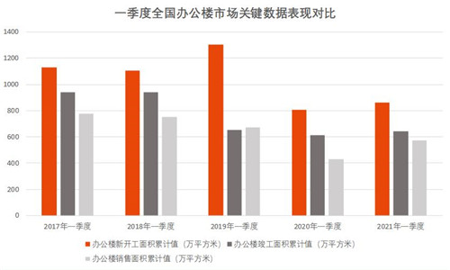 市場銷售方面,一季度全國辦公樓銷售面積575萬平方米,較2020年同期增長34.4%,與2019年一季度(671萬平方米)仍有差距,但已經(jīng)顯示出疫情后良好的恢復(fù)態(tài)勢。