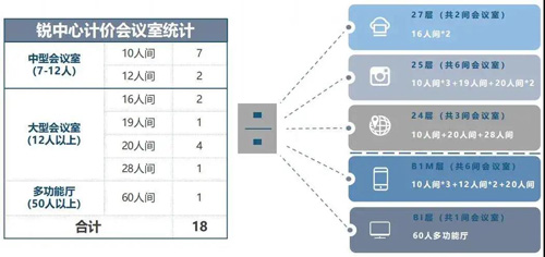 一共18間,小中大型會(huì)議室一應(yīng)俱全,完全能夠覆蓋從初創(chuàng)型公司到大型企業(yè)的會(huì)議需求;