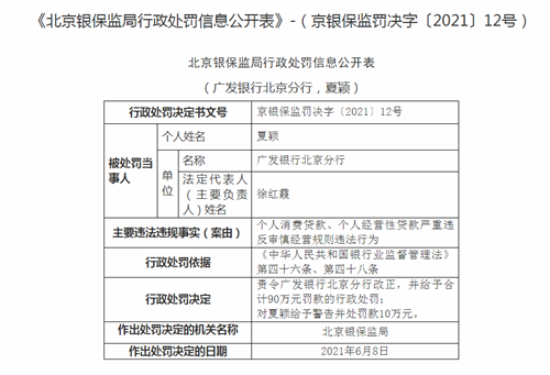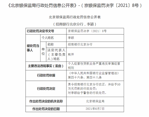房訊網(wǎng)訊 6月8日,北京銀保監(jiān)局官網(wǎng)連續(xù)發(fā)布6張罰單,4家銀行因涉及消費貸、個人經(jīng)營性貸款嚴重違反審慎經(jīng)營規(guī)則等問題被罰,牽扯機構(gòu)有廣發(fā)銀行、浦發(fā)銀行、招商銀行及郵儲銀行在北京的分支機構(gòu)等。此次機構(gòu)被處罰金額達530萬元,10名工作人員也被一同問責,目前監(jiān)管已責令上述銀行整改。