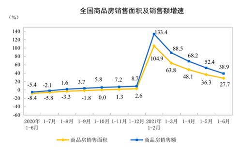 1—6月份,商品房銷售面積88635萬平方米,同比增長27.7%;比2019年1—6月份增長17.0%,兩年平均增長8.1%。其中,住宅銷售面積增長29.4%,辦公樓銷售面積增長10.0%,商業(yè)營業(yè)用房銷售面積增長5.7%。商品房銷售額92931億元,增長38.9%;比2019年1—6月份增長31.4%,兩年平均增長14.7%。其中,住宅銷售額增長41.9%,辦公樓銷售額增長10.7%,商業(yè)營業(yè)用房銷售額增長8.8%。