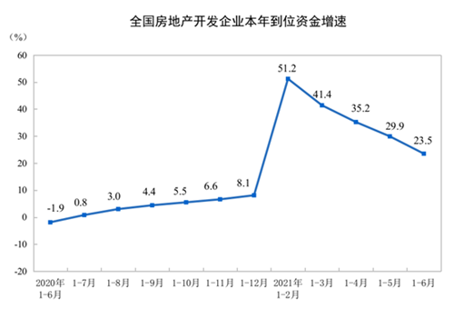 1—6月份,房地產(chǎn)開發(fā)企業(yè)到位資金102898億元,同比增長23.5%;比2019年1—6月份增長21.1%,兩年平均增長10.0%。其中,國內(nèi)貸款13465億元,下降2.4%;利用外資42億元,下降9.1%;自籌資金30153億元,增長11.9%;定金及預(yù)收款39625億元,增長49.7%;個人按揭貸款16355億元,增長23.9%。