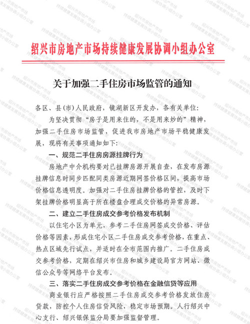 房訊網(wǎng)訊 近日,浙江紹興市出臺(tái)加強(qiáng)二手住房市場(chǎng)監(jiān)管的通知,將加強(qiáng)對(duì)二手住房掛牌價(jià)格的管控,及時(shí)下架掛牌價(jià)格明顯高于所在樓盤合理成交價(jià)格的異常房源。