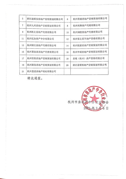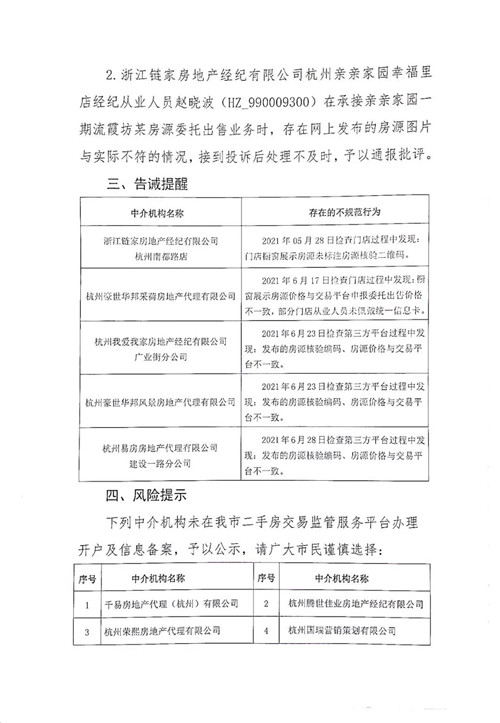 7月6日,杭州市房地產中介行業(yè)協(xié)會根據(jù)6月檢查情況發(fā)布了第四期行業(yè)通報:14名房地產中介機構從業(yè)人員被通報批評,5家中介機構被告誡提醒,21家中介機構被風險提示,2家中介機構被表揚。