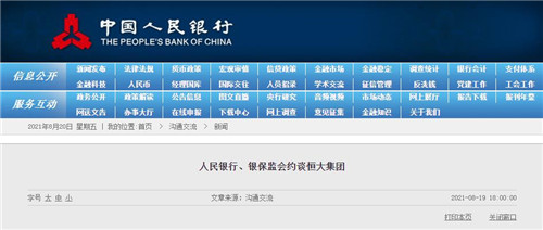 2021年8月19日,人民銀行、銀保監(jiān)會(huì)相關(guān)部門負(fù)責(zé)同志約談恒大集團(tuán)高管。