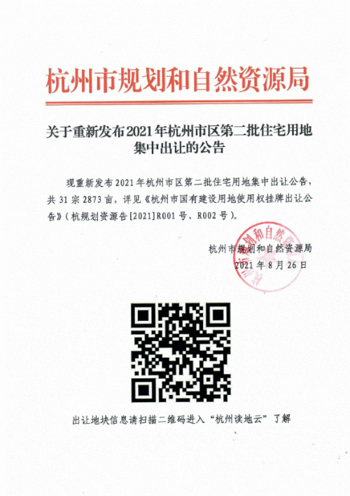房訊網(wǎng)訊 8月26日,杭州市重新發(fā)布了2021年第二批住宅用地集中出讓公告(杭規(guī)劃資源告[2021]R001號、R002號),涉及的出讓地塊不變,共31宗,面積2873畝。