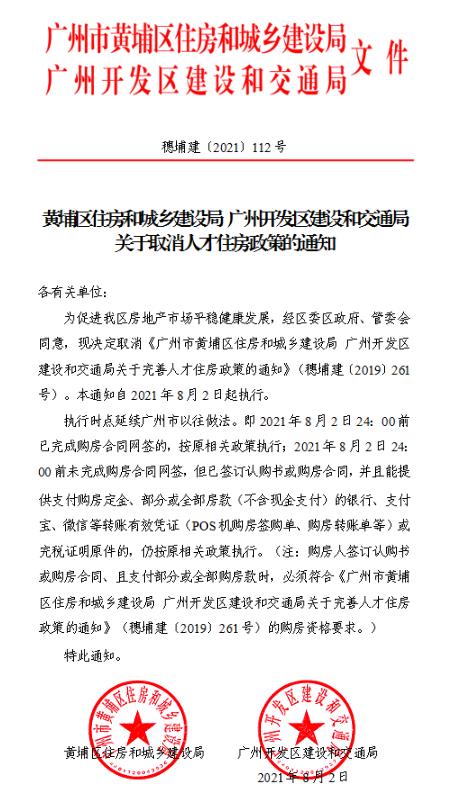 房訊網(wǎng)訊 8月2日,黃埔區(qū)住房和城鄉(xiāng)建設(shè)局、廣州開發(fā)區(qū)建設(shè)和交通局發(fā)布關(guān)于取消人才住房政策的通知,決定取消《廣州黃浦區(qū)住房和城鄉(xiāng)建設(shè)局 廣州開發(fā)區(qū)建設(shè)和交通局關(guān)于完善人才住房政策的通知》(穗埔建{2019}261號)。