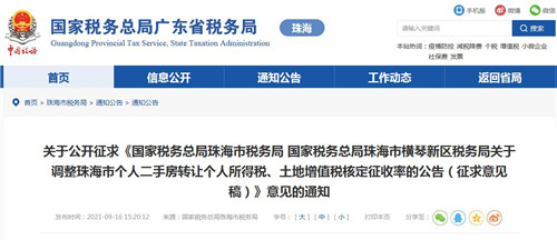 房訊網(wǎng)訊 國家稅務(wù)總局珠海市稅務(wù)局起草了《國家稅務(wù)總局珠海市稅務(wù)局 國家稅務(wù)總局珠海市橫琴新區(qū)稅務(wù)局關(guān)于調(diào)整珠海市個(gè)人二手房轉(zhuǎn)讓個(gè)人所得稅、土地增值稅核定征收率的公告(征求意見稿)》,并向社會(huì)公開征求意見。公告從2021年11月1日起執(zhí)行。