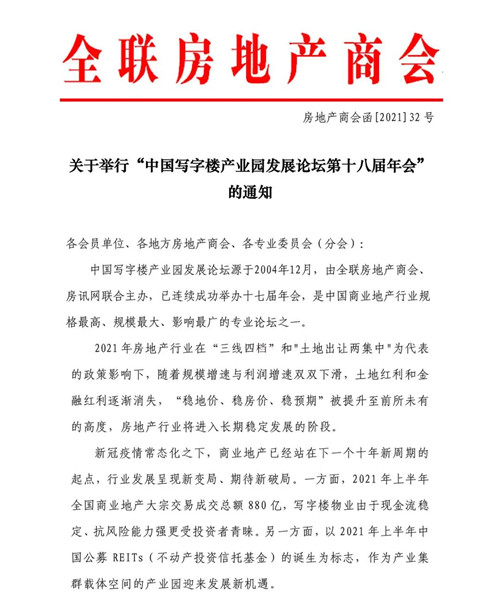 房訊網(wǎng)訊 中國(guó)寫(xiě)字樓產(chǎn)業(yè)園發(fā)展論壇第十八屆年會(huì)定于2021年12月8-9日在北京富力萬(wàn)麗酒店舉行,論壇主題為“變局與破局:商業(yè)地產(chǎn)的下一個(gè)十年”。