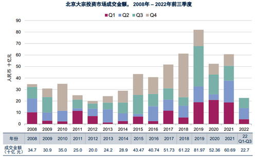 北京大宗投資市場在三季度的整體表現(xiàn)較為平穩(wěn),完成了若干宗投資交易,該季度投資市場累計成交金額約88.9億元。前三季度,北京大宗投資市場相較往年仍然低迷,累計成交金額約226.85億元,較去年同期下降55.2%。預計2022年四季度北京大宗投資市場仍然波瀾不驚,賣方與潛在買家仍處于博弈的階段,賣方希望加速拋售資產(chǎn)進行變現(xiàn),但潛在買家會謹慎出手且對可售項目進行仔細甄別。此外,自用型收購及通過法拍渠道購得資產(chǎn)有可能在年末進一步增加。
