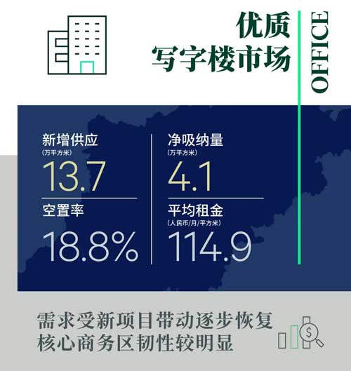 2022年第三季度寫字樓市場(chǎng)錄得兩個(gè)新項(xiàng)目交付,分別位于濱江和西溪板塊,共計(jì)13.7萬平方米,環(huán)比增長140%。隨著上半年TMT等行業(yè)整頓告一段落,凈吸納量錄得4.1萬,環(huán)比增長53%,同比下調(diào)72%,其中受新項(xiàng)目帶動(dòng)近六成。分級(jí)市場(chǎng)而言,錢江新城為首的核心商務(wù)區(qū)需求回暖相較明顯,各區(qū)惠企紓困的政策落實(shí)也為中小微企業(yè)較為集聚的新興子市場(chǎng)逐漸帶來新轉(zhuǎn)機(jī)。整體市場(chǎng)表現(xiàn)仍較去年同期平淡,空置率連續(xù)兩個(gè)季度上調(diào),環(huán)比微升0.9百分點(diǎn)至18.8%。