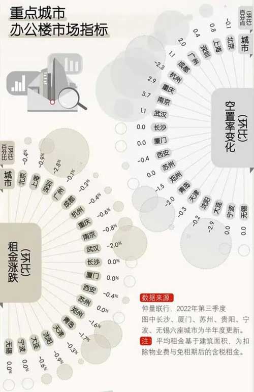 從前三季度的寫字樓市場來看,除頭部城市表現(xiàn)出企穩(wěn)向好的態(tài)勢以外,其他重點(diǎn)城市受制于經(jīng)濟(jì)波動(dòng)和疫情影響,辦公樓租賃擴(kuò)張受阻,市場承壓。