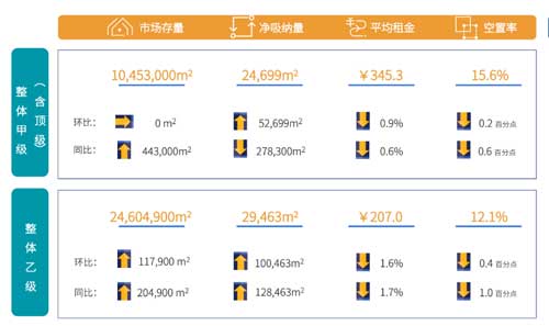 2、為提振去化和挽留客戶,部分項(xiàng)目業(yè)主繼續(xù)下調(diào)租金,使得全市甲級(jí)及乙級(jí)寫字樓市場(chǎng)平均租金環(huán)比均明顯下降。