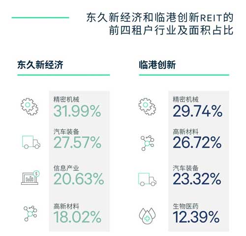 以此次上市的臨港創(chuàng)新和東久新經(jīng)濟(jì)REIT為例,根據(jù)招募說明書公布的信息,其租戶集中地來自于精密機(jī)械、汽車、新材料、信息產(chǎn)業(yè)和生物醫(yī)藥這五個(gè)先進(jìn)制造和高科技產(chǎn)業(yè)。