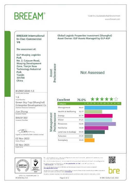BRE對(duì)普洛斯武清物流園的綠色管理和運(yùn)營(yíng)表現(xiàn)進(jìn)行了全面系統(tǒng)的評(píng)估。得益于普洛斯ASP豐富的運(yùn)營(yíng)管理經(jīng)驗(yàn)及完善的管理體系,園區(qū)在科技化高效管理、智能化資源監(jiān)控與改善、引導(dǎo)產(chǎn)業(yè)鏈零碳轉(zhuǎn)型、風(fēng)險(xiǎn)控制和生物多樣性等五項(xiàng)綠色評(píng)估指標(biāo)上均表現(xiàn)優(yōu)異,因此獲得了BREEAM In-Use“卓越”級(jí)認(rèn)證。