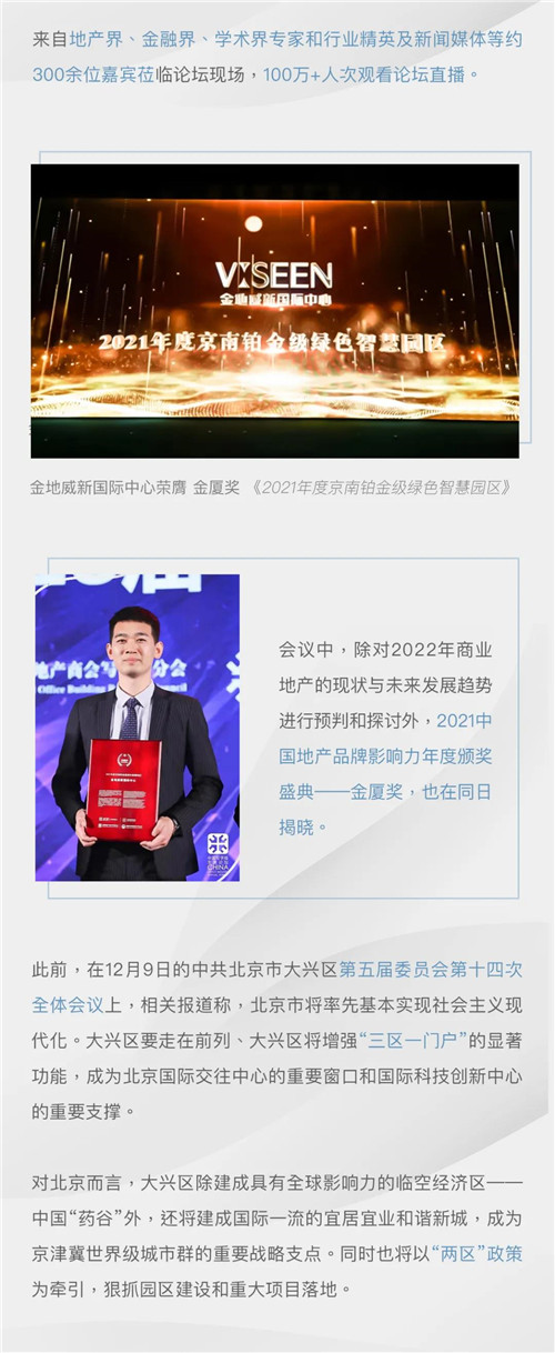 1月6日,中國寫字樓產業(yè)園發(fā)展論壇第十八屆年會在北京富力萬麗酒店舉行,論壇上除對2022年商業(yè)地產的現狀與未來發(fā)展趨勢進行預判和探討外,2021中國地產金廈獎也在同日揭曉,金地威新國際中心榮膺金廈獎“2021年度京南鉑金級綠色智慧園區(qū)”。