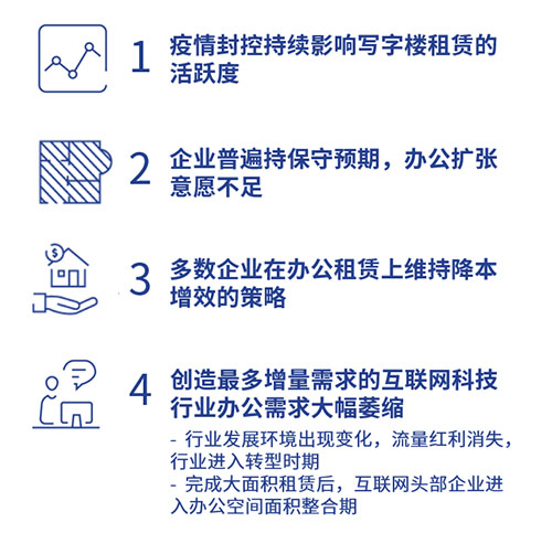 在沒有新增供應(yīng)壓力的情況下,市場(chǎng)行情出現(xiàn)快速反轉(zhuǎn),部分子市場(chǎng)空置率出現(xiàn)大幅上升主要是由于需求不足和退租面積增多所致。影響2022年市場(chǎng)需求走勢(shì)的四個(gè)核心因素: