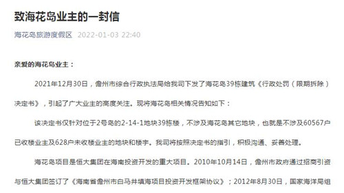 房訊網(wǎng)訊 1月3日夜間,恒大童世界集團(tuán)在官微發(fā)布《致;◢u業(yè)主的一封信》,稱2021年12月30日,儋州市綜合行政執(zhí)法局給我司下發(fā)了;◢u39棟建筑《行政處罰(限期拆除)決定書》,引起了廣大業(yè)主的高度關(guān)注。