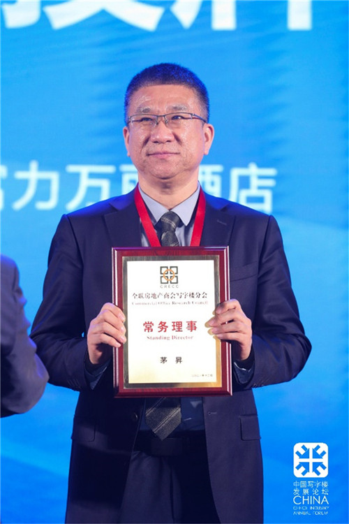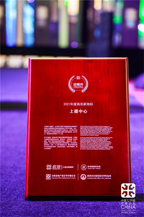在中國(guó)寫字樓產(chǎn)業(yè)園發(fā)展論壇第十八屆年會(huì)上,2021年中國(guó)地產(chǎn)金廈獎(jiǎng)重磅揭曉,并舉辦了盛大的頒獎(jiǎng)典禮,北京上德中心榮獲2021年度商務(wù)新地標(biāo)獎(jiǎng)項(xiàng),上德中心寫字樓總經(jīng)理茅昇上臺(tái)領(lǐng)獎(jiǎng),并出任全聯(lián)房地產(chǎn)商會(huì)寫字樓分會(huì)常務(wù)理事。