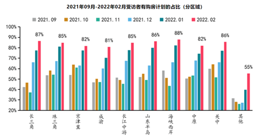 從各能級城市購房意愿來看,一線購房意愿居首,三四線購房意愿漲幅較大,長三角購房意愿強烈,關(guān)中地區(qū)購房意愿明顯改善,京津冀置業(yè)意愿相對較低。2月長三角地區(qū)有59%受訪者購房意愿強于上個月,京津冀地區(qū)購房者意愿相較于上個月減弱的占比高達19%,市場仍存一定觀望情緒。但伴隨貸款利率下降,近期北京樓市已逐步啟動,或?qū)迎h(huán)京地區(qū)市場升溫。