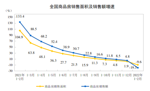 1—2月份,商品房銷售面積15703萬(wàn)平方米,同比下降9.6%,其中,住宅銷售面積下降13.8%;商品房銷售額15459億元,下降19.3%,其中,住宅銷售額下降22.1%。
