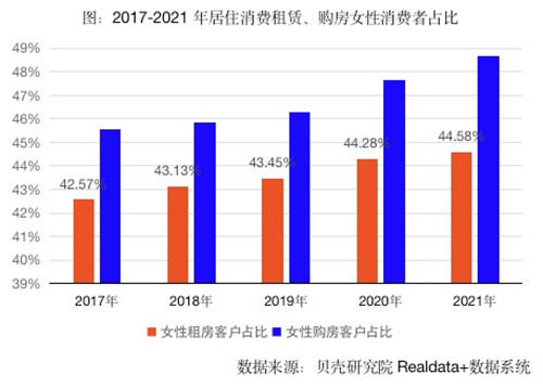 3月7日,貝殼研究院發(fā)布的《女性居住消費(fèi)調(diào)查報告2022》顯示,從租、購消費(fèi)趨勢看,女性消費(fèi)者占比連續(xù)5年呈上升趨勢。
