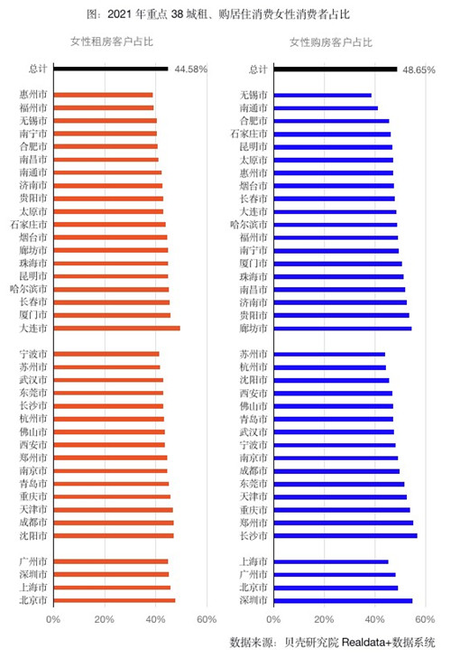 不過,不同城市之間存在差異,個別城市女性居住消費(fèi)潛力不斷釋放,女性消費(fèi)者占比提升較快。