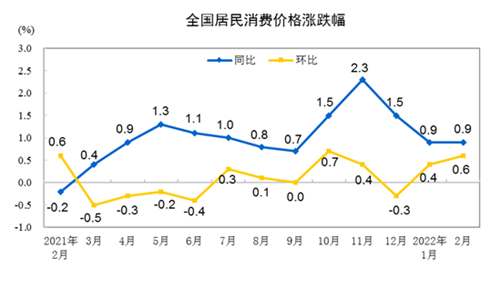 房訊網(wǎng)訊 國(guó)家統(tǒng)計(jì)局發(fā)布數(shù)據(jù)顯示,2022年2月份,全國(guó)居民消費(fèi)價(jià)格同比上漲0.9%,環(huán)比上漲0.6%。1—2月平均,全國(guó)居民消費(fèi)價(jià)格比上年同期上漲0.9%。