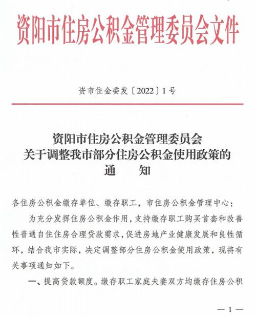 房訊網(wǎng)訊 近日,四川省資陽市發(fā)布《關(guān)于調(diào)整我市部分住房公積金使用政策的通知》,支持繳存職工購買首套和改善性普通自住住房合力貸款需求,促進(jìn)房地產(chǎn)業(yè)健康發(fā)展和良性循環(huán),結(jié)合本市實際,調(diào)整部分住房公積金使用政策。