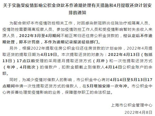 房訊網(wǎng)訊 近日,上海市公積金管理中心發(fā)布通知,公布實施受疫情影響公積金貸款不作逾期處理有關措施和4月提取還貸計劃安排。