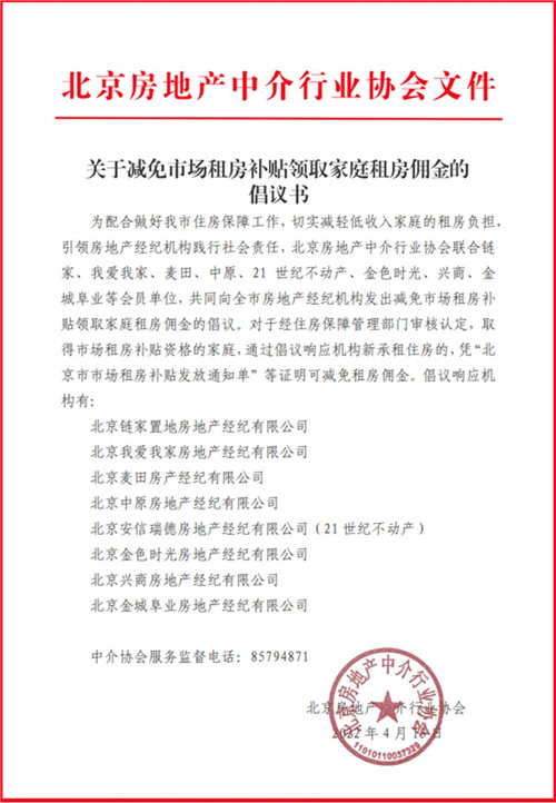 房訊網(wǎng)訊 4月13日,北京房地產(chǎn)中介行業(yè)協(xié)會官微發(fā)布《關(guān)于減免市場租房補(bǔ)貼領(lǐng)取家庭租房傭金的倡議書》,聯(lián)合鏈家、我愛我家、麥田、中原、21世紀(jì)不動產(chǎn)、金色時光、興商、金城阜業(yè)等會員單位,共同向全市房地產(chǎn)經(jīng)紀(jì)機(jī)構(gòu)發(fā)出倡議:對于經(jīng)住房保障管理部門審核認(rèn)定,取得市場租房補(bǔ)貼資格的家庭,通過倡議響應(yīng)機(jī)構(gòu)新承租住房的,憑“北京市市場租房補(bǔ)貼發(fā)放通知單”等證明可減免租房傭金。