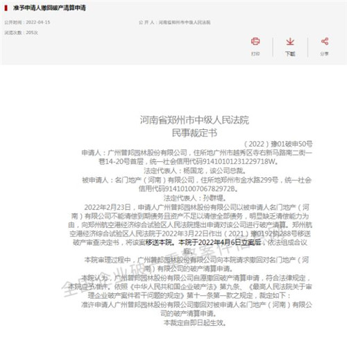 4月15日,全國(guó)企業(yè)破產(chǎn)重整案件信息網(wǎng)最新發(fā)布《河南省鄭州市中級(jí)人民法院民事裁定書(shū)》。《裁定書(shū)》顯示,廣州普邦園林股份有限公司撤回對(duì)名門(mén)地產(chǎn)(河南)有限公司的破產(chǎn)清算申請(qǐng)。