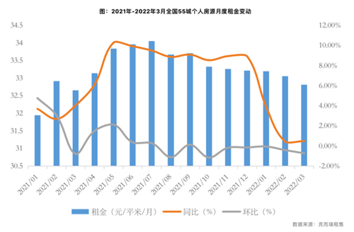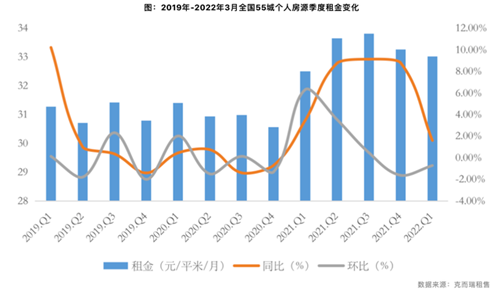 4月15日,據(jù)克而瑞租售監(jiān)測數(shù)據(jù)顯示,2022年一季度,全國55城個人房源租金為33.02元/平方米/月,環(huán)比下跌0.72%,同比上漲1.6%,較2021年整體來看,租金上漲幅度明顯下降。