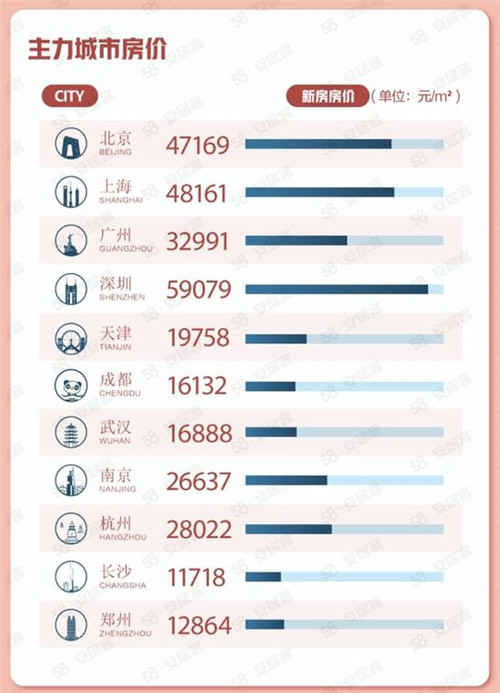 主力城市中,深圳新房線上均價為59079元/㎡,上海和北京分別為48161元/㎡和47169元/㎡,廣州為32991元/㎡。新一線城市中杭州和南京的新房線上均價分別為28022元/㎡、26637元/㎡。