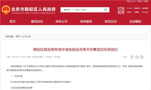 房訊網(wǎng)訊 為落實(shí)朝陽(yáng)區(qū)《關(guān)于繼續(xù)加大中小微企業(yè)幫扶力度加快困難企業(yè)恢復(fù)發(fā)展的若干措施》要求,做好鼓勵(lì)商務(wù)樓宇減免租金工作,朝陽(yáng)區(qū)發(fā)展改革委制定《朝陽(yáng)區(qū)鼓勵(lì)商務(wù)樓宇減免租金政策支持事宜的實(shí)施細(xì)則》。