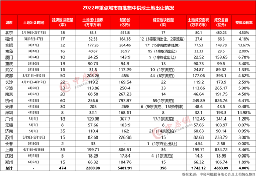 據(jù)中房網(wǎng)不完全統(tǒng)計,今年22城首批集中供地總成交住宅用地(含綜合用地)396宗,土地成交面積1742.12萬平方米,土地出讓金總額達(dá)4883.09億元,整體溢價率約為4%。