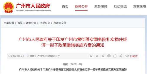 房訊網(wǎng)訊 6月23日,廣州市政府官網(wǎng)發(fā)布《廣州市貫徹落實(shí)國(guó)務(wù)院〈扎實(shí)穩(wěn)住經(jīng)濟(jì)的一攬子政策措施〉實(shí)施方案》,推出包括財(cái)政政策、貨幣金融政策、穩(wěn)投資促消費(fèi)政策、保糧食能源安全政策、保產(chǎn)業(yè)鏈供應(yīng)鏈穩(wěn)定政策、;久裆叩6方面152項(xiàng)細(xì)化政策措施。