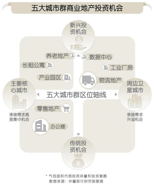 城市群的發(fā)展模式也對(duì)商業(yè)地產(chǎn)租賃以及投資市場(chǎng)的布局產(chǎn)生影響。仲量聯(lián)行中國(guó)區(qū)研究部總監(jiān)姚耀表示,五大城市群中的主要核心城市將在支撐傳統(tǒng)的辦公樓和零售地產(chǎn)市場(chǎng)的同時(shí),催生產(chǎn)業(yè)園區(qū)、長(zhǎng)租公寓和養(yǎng)老地產(chǎn)等新興投資機(jī)會(huì);周邊衛(wèi)星城則將承接需求外溢,物流地產(chǎn)將迎重大利好,工業(yè)廠房、數(shù)據(jù)中心和養(yǎng)老地產(chǎn)等也將獲得投資者的關(guān)注。