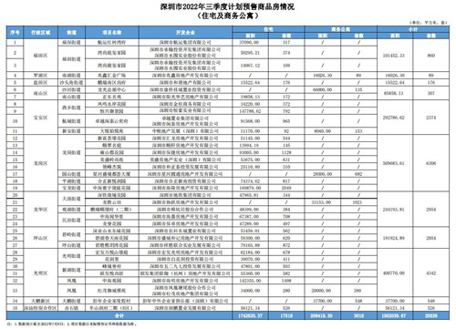 房訊網(wǎng)訊 7月8日,深圳市住房和建設局公示了2022年三季度商品住宅和商務公寓房源信息情況。截至2022年7月8日,深圳市2022年三季度計劃入市的商品住宅及商務公寓項目35個,預計供應房源面積為195.20萬平方米,20536套,其中:住宅174.26萬平方米,17518套;商務公寓20.94萬平方米,3018套。
