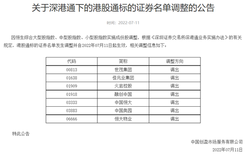 根據(jù)公告顯示,世茂集團(tuán)、佳兆業(yè)集團(tuán)、融創(chuàng)中國(guó)、火巖控股、中國(guó)恒大、中國(guó)奧園和恒大物業(yè)均被調(diào)出。