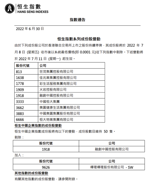 此前6月30日,恒生指數(shù)公司官網(wǎng)亦有公布恒生指數(shù)系列成份股變動(dòng)結(jié)果,除上述7家公司外,還有兩家物業(yè)管理公司彩生活服務(wù)和奧園健康也被調(diào)出恒生指數(shù)系列成分股,亦屬地產(chǎn)相關(guān)行業(yè)。